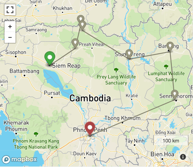 Itinerary: Siem Reap – Angkor – Koh Ker – Preah Vihear – Srayem – Stung Treng Province – Banlung – Mondulkiri Province – Sen Monorom – Phnom Penh